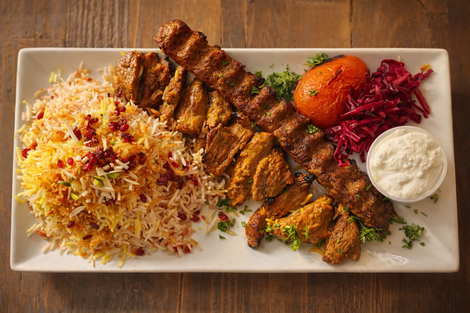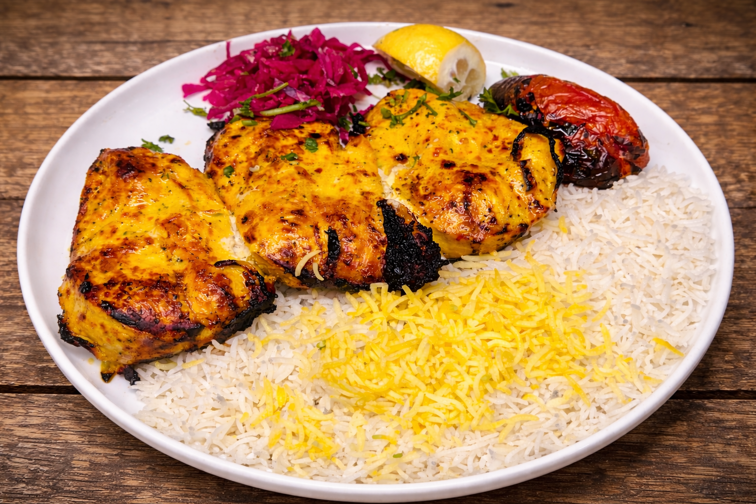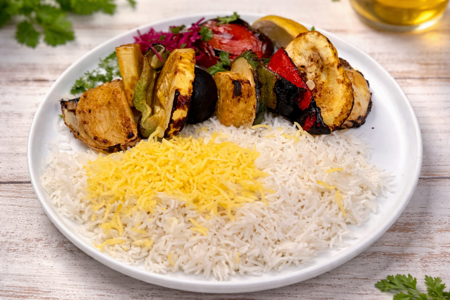 Cooked on a skewer on open flame grill. Served with basmati saffron rice and grilled tomato. Substitute: salad/fries $0, mix rice +$4, grilled veggies +$5